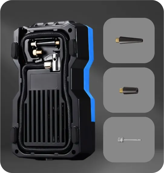 Компрессор автоматически отключается при достижении заданного давления и сохраняет настройку для следующего использования. Подходит для всех типов накачивания. Три дополнительные насадки позволяют накачивать практически все, от шин до спортивных мячей.