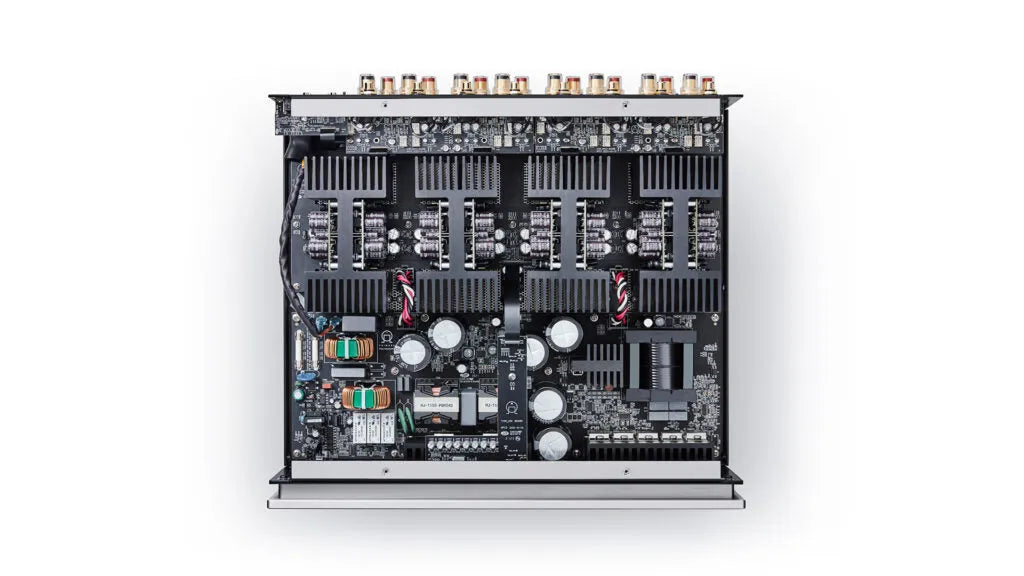Продуманная конструкция схемы8 обеспечивает максимально прямую подачу и равномерное распределение мощности от блока питания к модулям усилителя, расположенным в радиаторах, которые изолируют их от любых помех, связанных с источником питания. В свою очередь, эта инновационная конструкция изолирует входной и выходной каскады от любых помех, которые могут создавать модули усилителя. Входные и выходные сигналы передаются к модулю усилителя и от него через непрерывную ленту печатной платы, пропущенную через канал в радиаторах, что обеспечивает кратчайший путь сигнала.