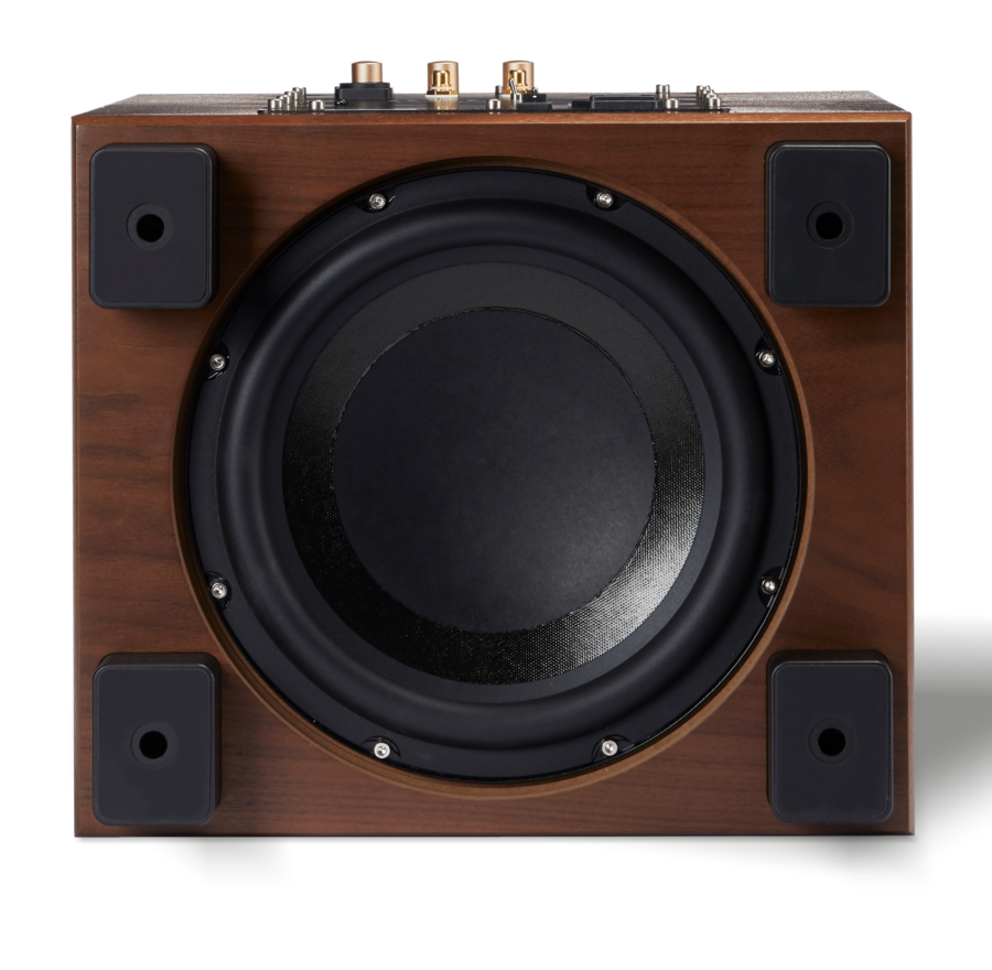 Classic 98 воплощает суть наших знаменитых 10-дюймовых моделей с направленным вниз динамиком конца 90-х годов. Богатый натуральный шпон ореха излучает тепло и аутентичность, напоминая стереосистемы середины века. Закругленный изгиб, подчёркнутый едва заметной линией, демонстрирует современное мастерство, отдавая дань уважения дизайну прошлых лет. Задняя панель усилителя с шелкографией из белого золота и контрастными ручками пробуждает воспоминания об эпохе, а глянцевый чёрный логотип на матовом фоне добавляет нотку современности.