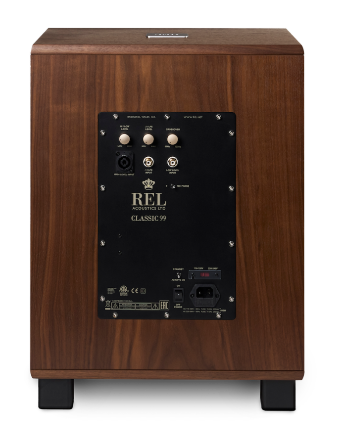 Classic 99 перенимает язык форм, представленный в модели 98. Удобный, как пара поношенных туфель, он отличается массивными стенками корпуса толщиной 32 мм, облицованными богатым, тёплым ореховым шпоном и подобранными вручную с особой тщательностью. Простейшие значки из натурального алюминия и плавно изогнутые ножки, фрезерованные из цельной заготовки, чёрные, чтобы создать ощущение парения, гарантируют, что ничто, даже решётка, не нарушит атмосферу. Однако, как и у всех REL, стиль выражает нечто большее, чем просто комфорт. 12-дюймовый динамик, направленный вниз, хотя и не виден, несомненно, будет ощущаться. Переходя к задней панели, можно заметить, что точная детализация той эпохи распространяется и на панель усилителя, где все элементы управления отделаны прекрасным белым золотом. Всё, что вы видите, оснащается качественными переключателями, даже щелчок фазового переключателя близок к идеалу. Качество повсюду, куда ни глянь или к чему ни прикоснёшься. Не удивляйтесь, если ваши дети будут драться из-за него в будущем.