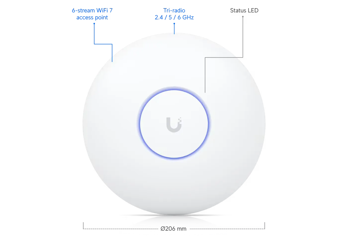 UBIQUITI U7-Pro — точка доступа стандарта Wi-Fi 7, разработанная для сред с высокой нагрузкой. Она обеспечивает быстрое, стабильное и низкопомеховое беспроводное соединение, работая на частоте 6 ГГц. Подходит для установки как на потолок, так и на стены.